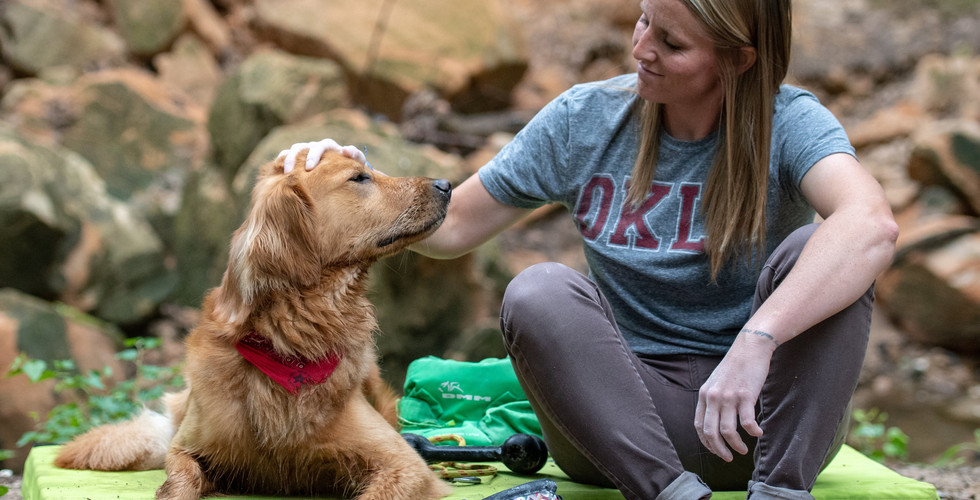 Sarah Toews climbed some as a child, but really picked up bouldering about three years ago. Two years ago, she and her husband, Christian, decided they wanted a dog and fell in love with their golden retriever. When Sarah and Christian Toews adopted Teddy, also known as Theodore the Golden Boy, they drove all the way to Iowa to do it, with no regrets. His dad was a champion dog, his mom a house dog, and now he’s a crag dog.